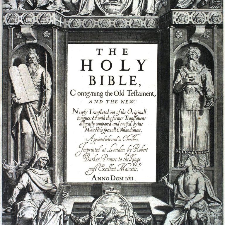 The King James Bible was first published in the same year, 1611. It became the Authorized Version of the Church of England, the standardised version of the scripture for centuries.