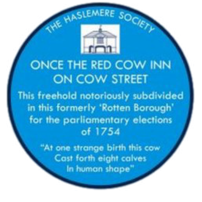 A plaque on the wall of the building that was once the Red Cow, whose freehold was divided into eight, to multiply the voting rights of the owner.